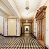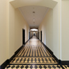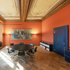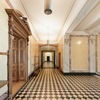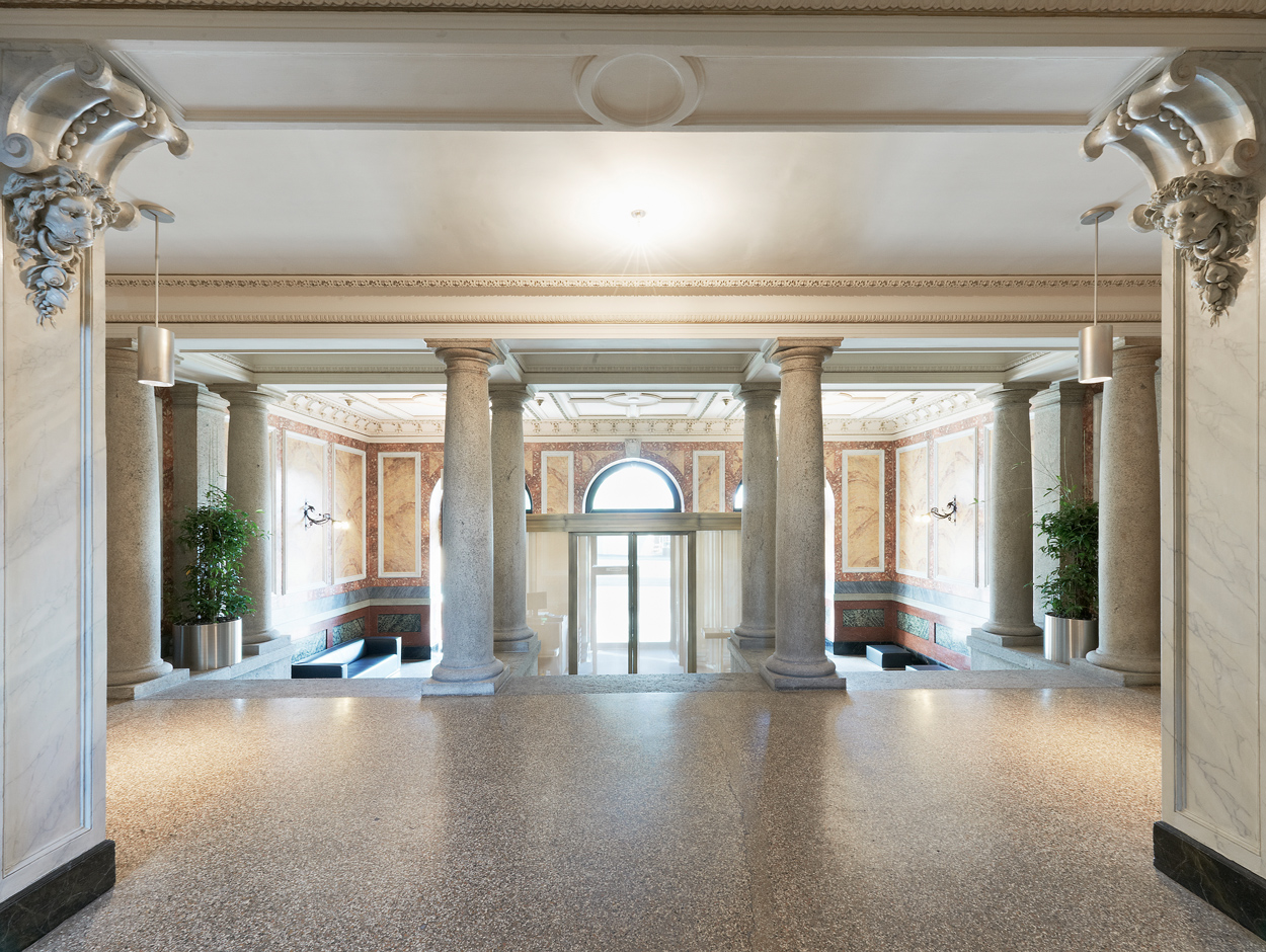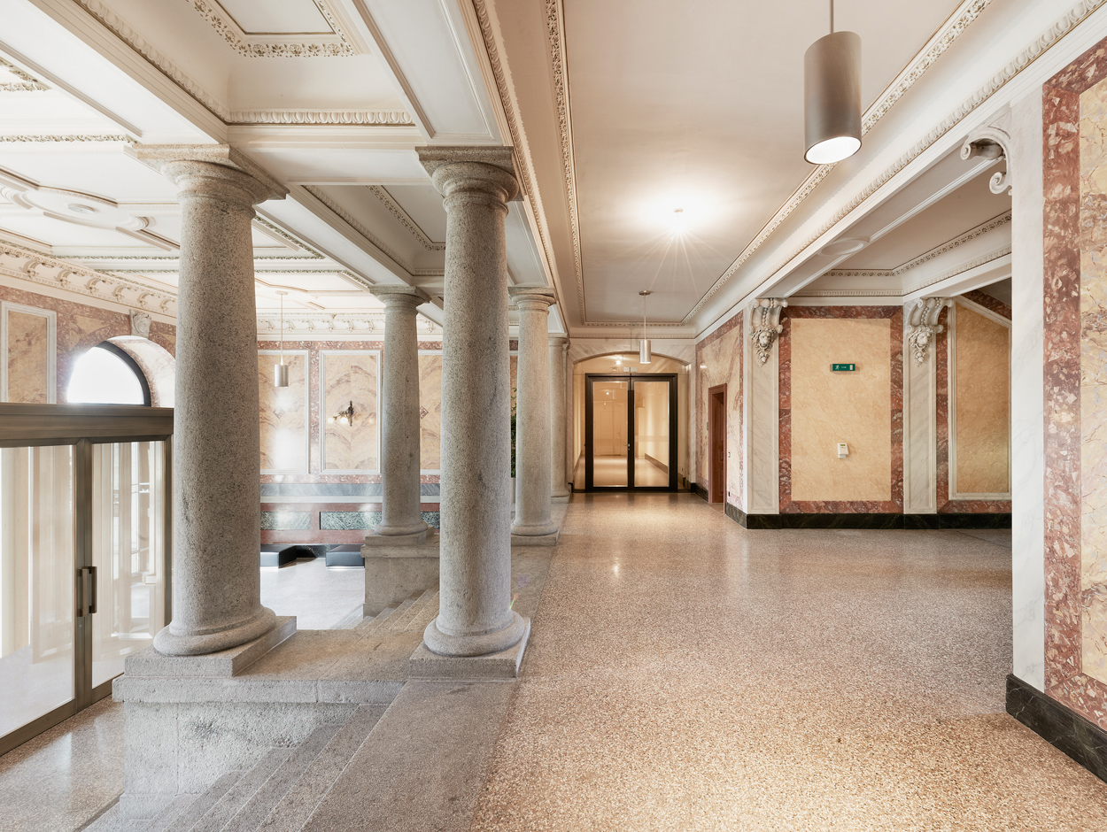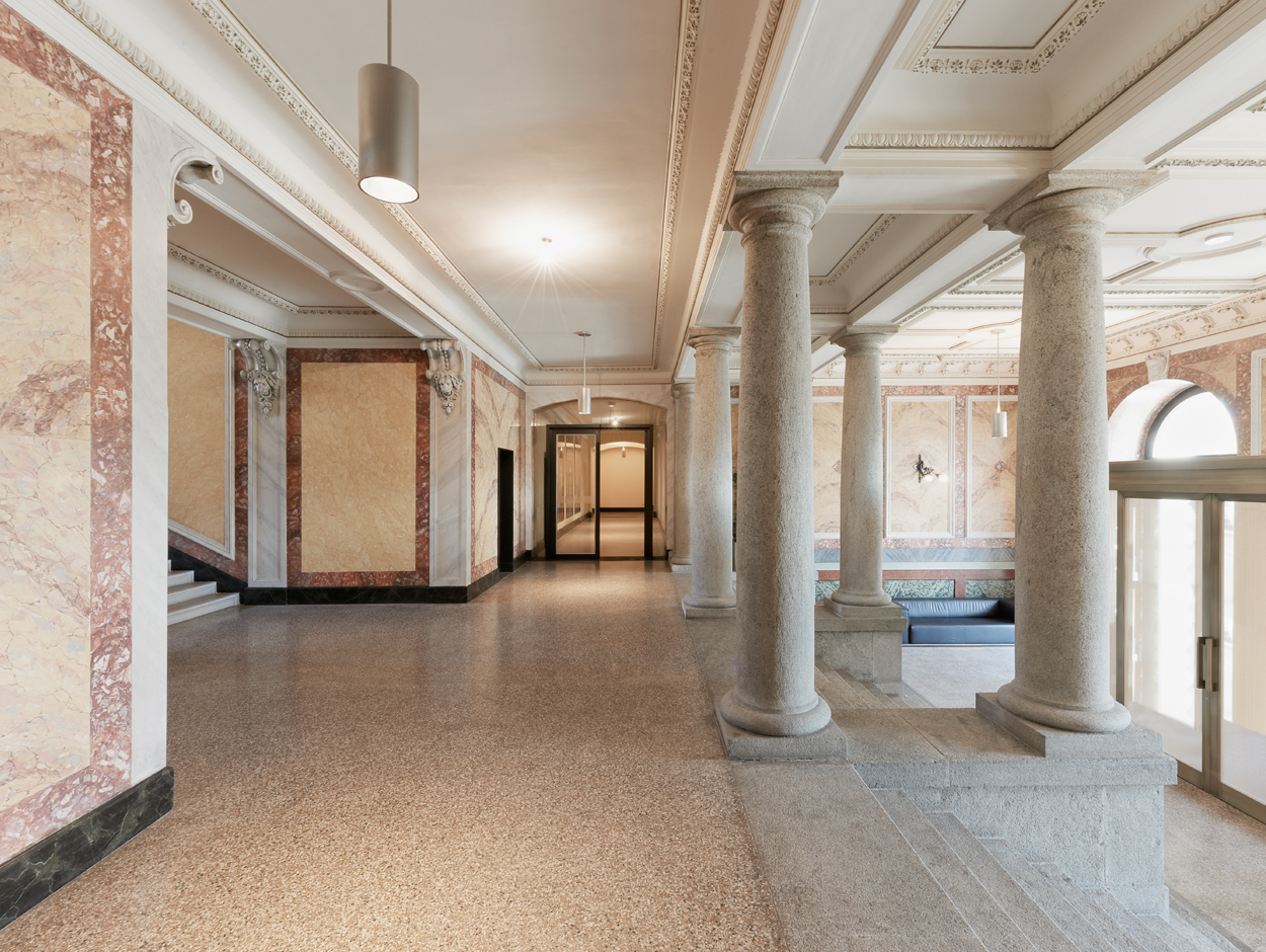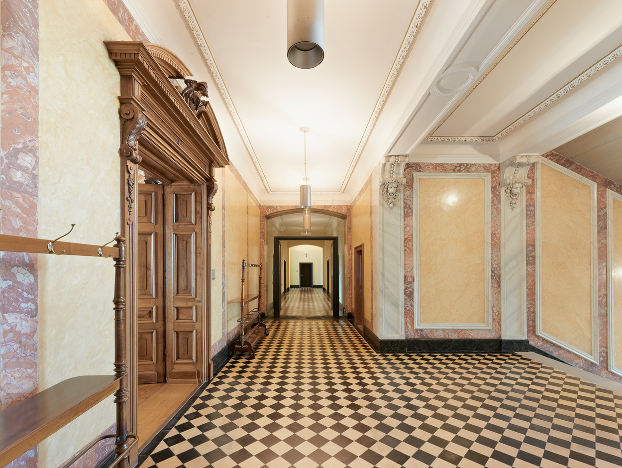 Le jaune chaud des murs du corridor correspond aux marbrures historiques et se réfère également à l'ocre du carrelage (terrazzo), qui remonte à l'époque de la construction.