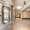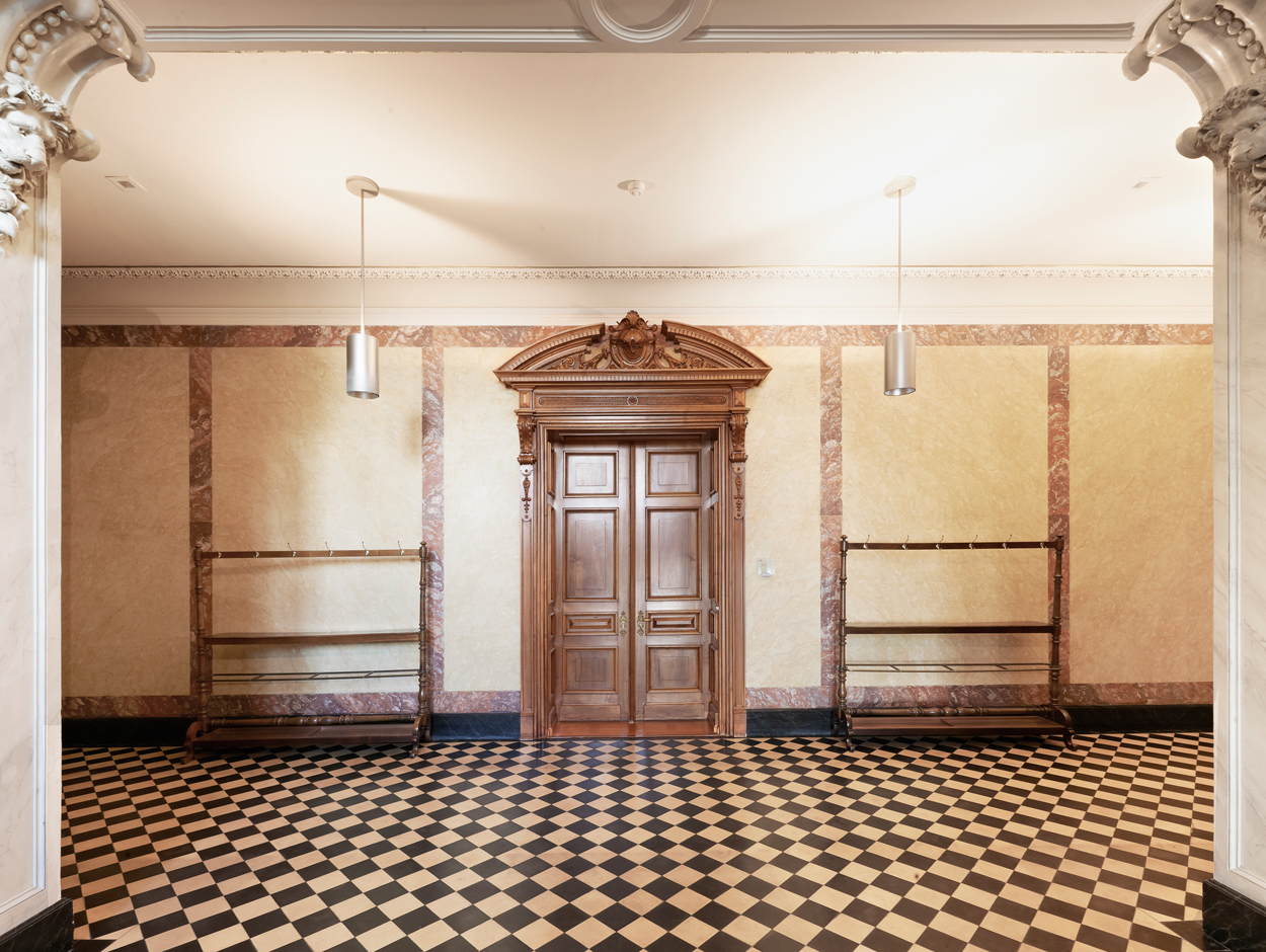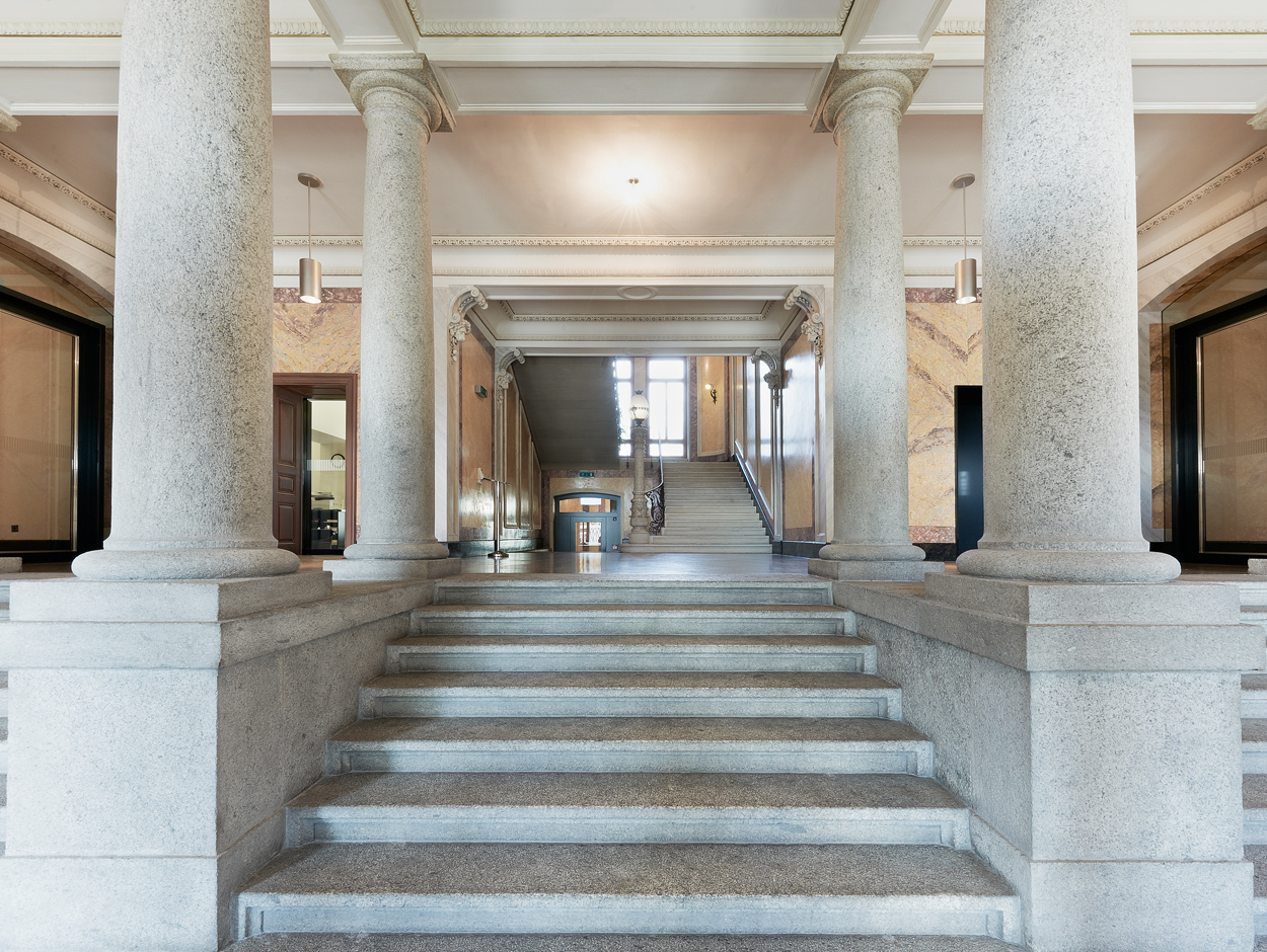Le vaste hall d'entrée est dominé par huit colonnes de granit de Wassen. Celles-ci encadrent un escalier en trois parties, également en granit de Wassen, qui conduit au rez-de-chaussée supérieur.