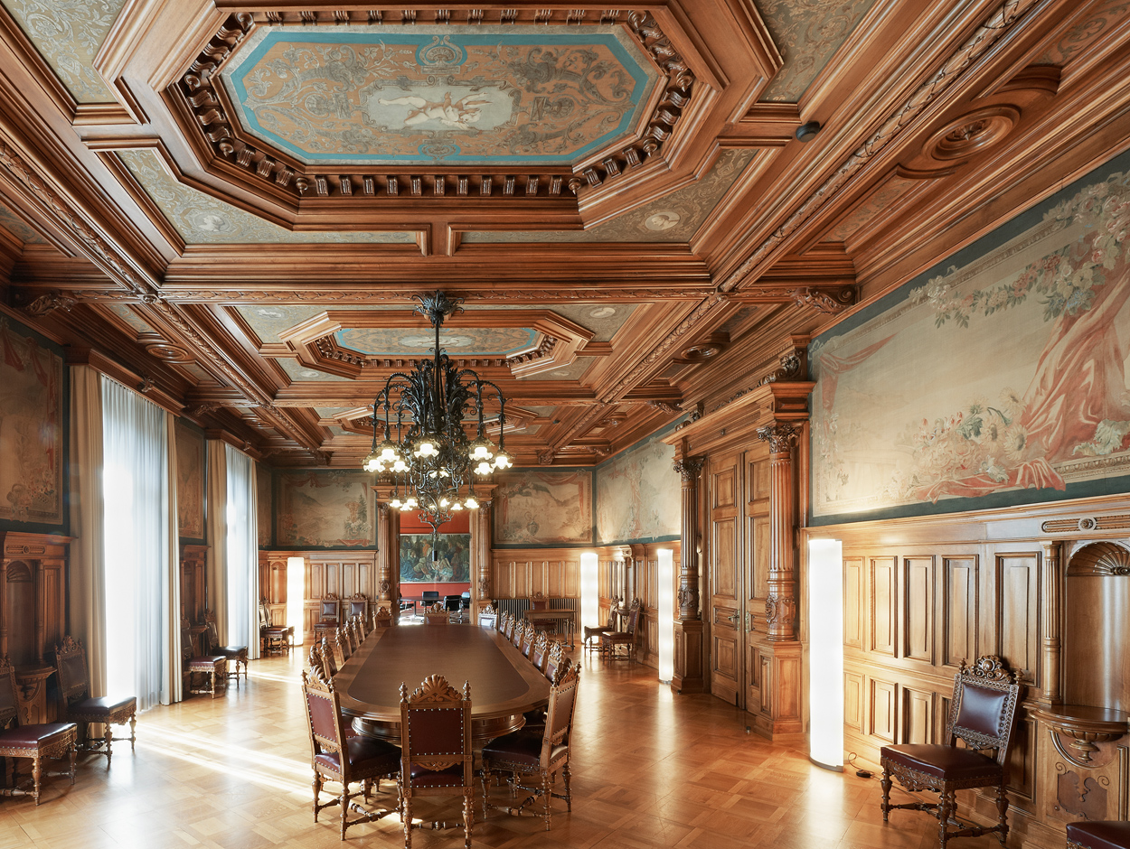 Les tentures murales peintes posées au-dessus des boiseries en noyer ont été nettoyées, restaurées et tendues sur de nouveaux cadres en 2002.