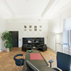 Son aménagement – plancher de chêne, murs blancs et plafond acoustique rouge – crée à la fois distance et proximité.